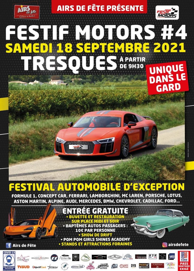 Organisée par l’association Airs de Fête, la quatrième édition du Festif Motors, l’unique festival d’automobiles d’exception du Gard, aura lieu le samedi 18 septembre de 9 h 30 à 21 h 30 sur la place du marché à Tresques ! Formule 1, concept car, super-car, sportive, américaine, prestige, collection, venez admirer ces nombreux véhicules venus des quatre coins du sud de la France sur la place du village, transformée en paddock de circuit pour l’ occasion